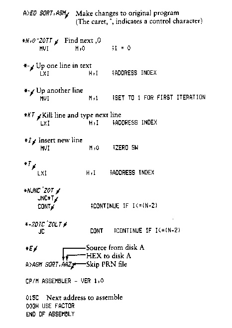 which contains an 8080 assembly-language source file. The first and second forms shown above differ only in that the second form allows parameters to be passed to the assembler to control source file access and hex and print file destinations.