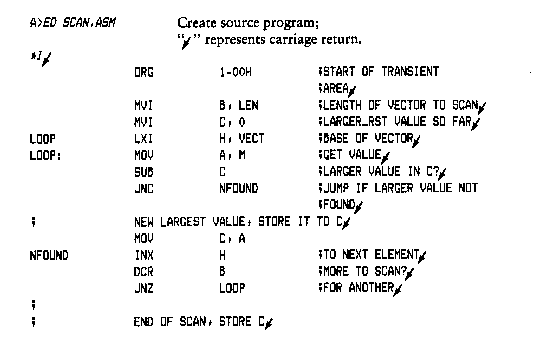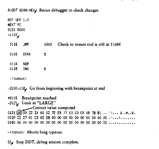 Upon completion of assembly language input, you can review the memory segment using the DDT disassembler (see the L command).