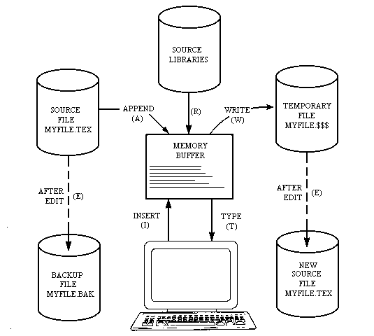 Generally, ED reads segments of the source file given by filename or filename.typ into the central memory, where you edit the file and it is subsequently written back to disk after alterations. If the source file does not exist before editing, it is created by ED and initialized to empty. The overall operation of ED is shown in Figure 2-1.